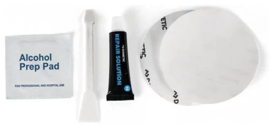 Zelfklevend, Hoge trekkracht, Flexibel, Zeer sterk, Flexibel, makkelijk in gebruik. 2x 7.5cm repair patches, 1x 5g repair solution, 1x alcohol wipe sachet, 1x spatula