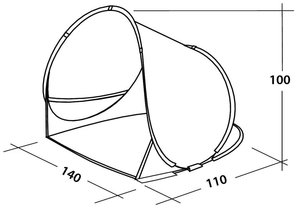 Als hij uit de ronde draagtas wordt gehaald springt hij gelijk open. Het ontwerp heeft een open voorkant en een grondzeil van duurzaam polyethyleen en hij biedt aan drie kanten bescherming tegen zon, wind en lichte regen zonder het zicht te verhinderen – iets was vooral handig is als er jonge kinderen bij zijn. Scheerlijnen helpen om de vorm te behouden.