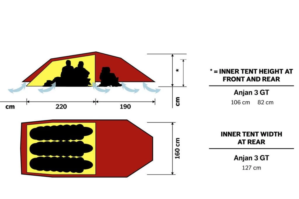 De tunnelconstructie biedt een optimale ruimte vs gewichtsverhouding. De Anjan 2 GT en 3 GT bieden voldoende ruimte voor 2 of 3 personen met hun bagage. Door de constructie is de tent met slechts 4 haringen op te zetten. Een optionele footprint beslaat de oppervlakte van zowel de binnentent als de luifel