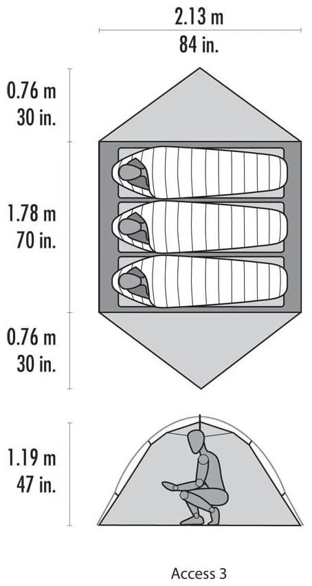 De MSR Access 3 is een lichtgewicht 3-persoons tent van ripstop nylon, die uitermate geschikt is voor wat koudere omstandigheden. Het ontwerp is zo gemaakt dat de tent bestand is tegen harde wind, en een sneeuwlast op het dak. De twee grote luifels aan de voor-en achterzijde bieden ruimte voor de bagage.