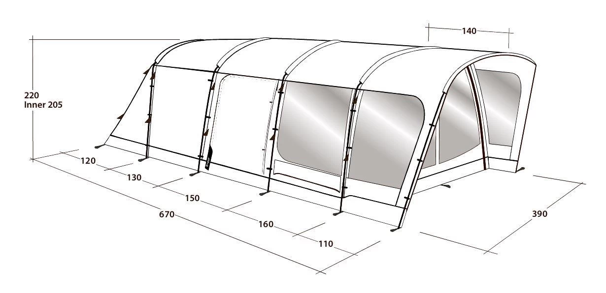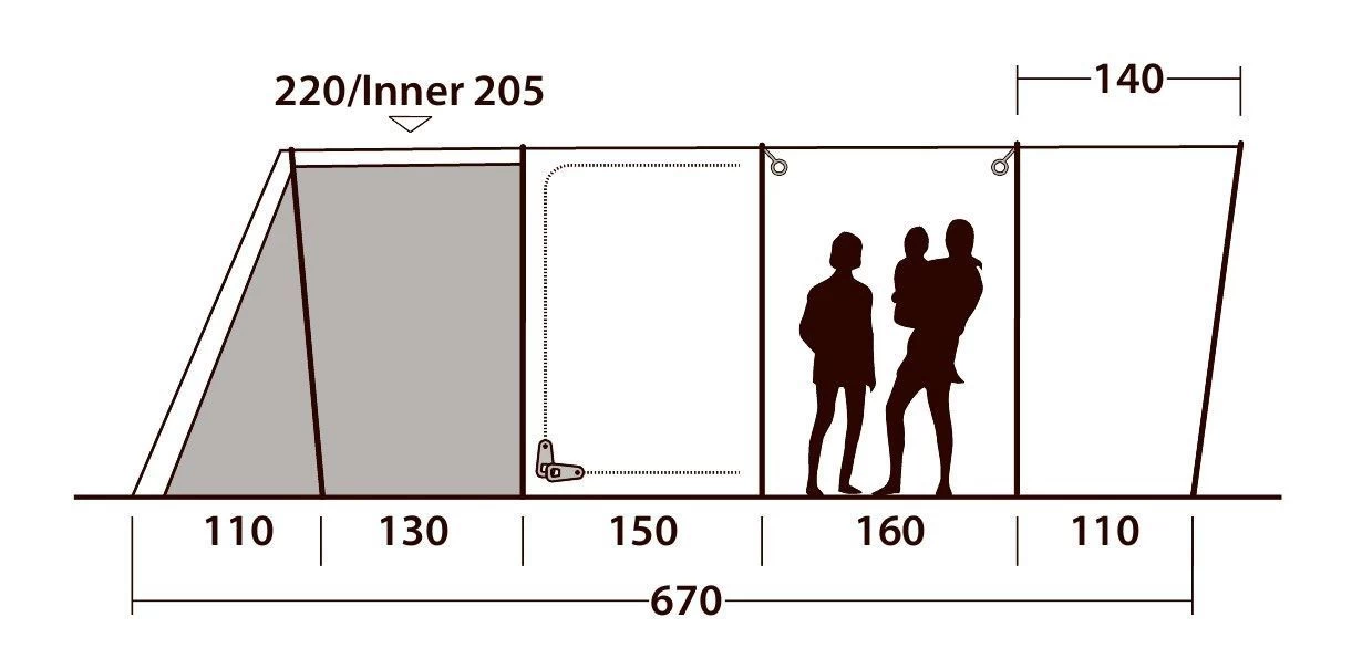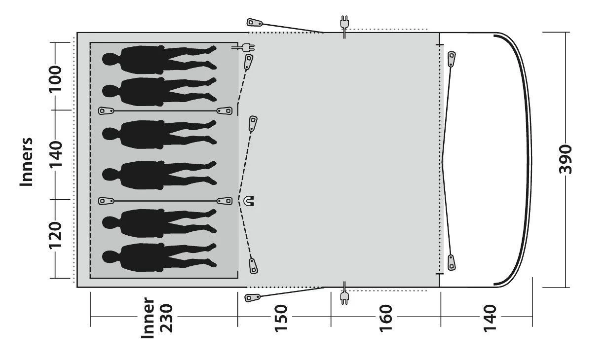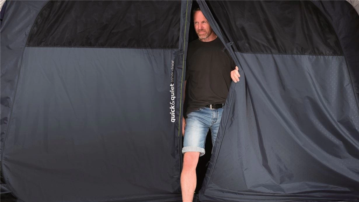 De Colorado 6PE biedt zes slaapplaatsen in drie Ambassador Master-slaapgedeeltes met donkere binnententen en Quick& Quiet-binnendeuren plus een verlengde voorkant en een groot woongedeelte in de tent. Dubbele D-deuren aan de zijkant met gaas zorgen voor flexibele toegang en extra ventilatiemogelijkheden. De voorgebogen tentstokken van ons Power Stability System zorgen voor uitstekende stabiliteit, steile wanden om de binnenruimte te maximaliseren en volledige hoofdruimte in de hele tent. Met het Outwell HookTrack System, Easy Pegging System, kabeldoorvoer, ritsgordijnen en ons Rear Ventilation System, zijn comfort zoals bij u thuis en gebruiksvriendelijkheid verzekerd.