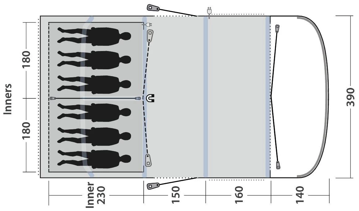 Het vloeiende profiel van de Hayward Lake 6ATC biedt zes slaapplaatsen in twee Ambassador Master-slaapgedeeltes met donkere binnententen en Outwell Quick & Quiet Inner Doors, heeft twee zijdeuren plus het Rear Ventilation System om de luchtstroom te reguleren. De voorgevormde luchtbuizen in gotische stijl zorgen voor stabiliteit en voldoende hoofdruimte met steilere zijkanten voor een maximale binnenruimte over het duurzame grondzeil van polyethyleen. Een diepe luifel boven het Outwell Easy Access Front Door System, met snel-en stilsluitende toegangsdeuren, biedt bescherming tegen stortbuien.