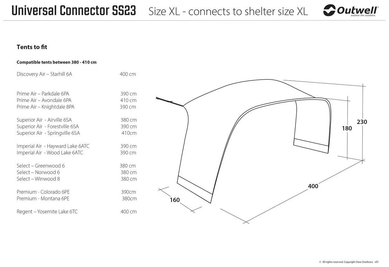 Zorg voor een overdekte centrale woonkamer voor gemeenschappelijke maaltijden en gezelligheid door Outwell tenten met elkaar te verbinden via een Outwell Summer of Event Lounge. De Universal Connector kan een lounge aan een tent bevestigen voor langdurig beschut buitenleven dat het gemak en comfort verbetert.