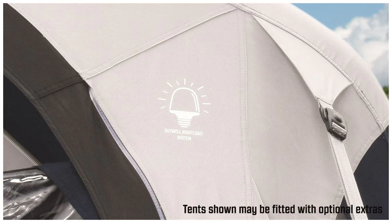Its technical cotton fabric maintains a pleasant internal temperature, perfect for the sunshine of Southern Europe as well as on colder days. Ventilation is easily boosted on very hot days by the mesh doors in both sides of the living area. With the addition of an optional ONS Light Unit Set, the welcoming Outwell Nightlight System (patented) at the front door guides you when darkness falls and the ONS inside the tent creates a cosy atmosphere through the evening.