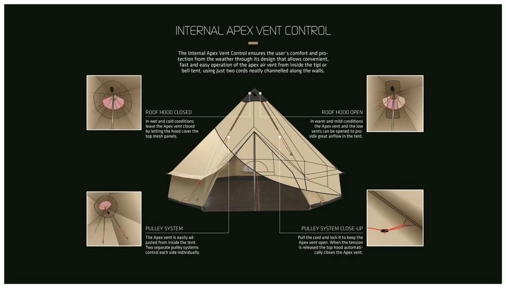 De ruime en populaire Klondike bell tent zorgt voor voortreffelijk comfort voor maximaal zes personen. De verticale deur zorgt voor eenvoudige toegang vooral bij slecht weer. Beschermende dakranden lopen rond de tent om de deur en muren te beschutten tegen wegstromende regen. Het grondzeil is voorzien van een rits naar de middenpaal uit aluminium, waardoor het aan de deur kan worden opgerold om een veilig gebied te creëren waarin de optionele kachel kan worden gebruikt en waar modderige laarzen kunnen worden bewaard. De handige Internal Apex Vent Control kan gemakkelijk van binnenuit worden geopend en gesloten en werkt via lage ventilatieopeningen met gaas om de verluchting te regelen.